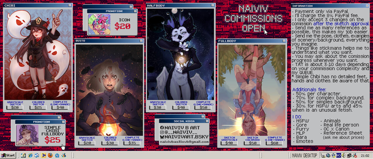 Pagamento via PIX, transferência bancária ou PAYPALPagamentos via PayPal: É cobrada uma tarifa de 8% do valor.Pagamentos: Ao efetuar pagamento antecipado (e escolher as artes), sua posição na fila é fixada. Se não, é colocado na waitlist e só será chamado após finalizar todas as comissões na sua frente.Comissões com urgência: Se sua comissão tiver urgência para entrega e/ou quer que sua comissão seja passada na frente na fila, terá que pagar uma taxa de 20% a mais do valor total da sua comissão.